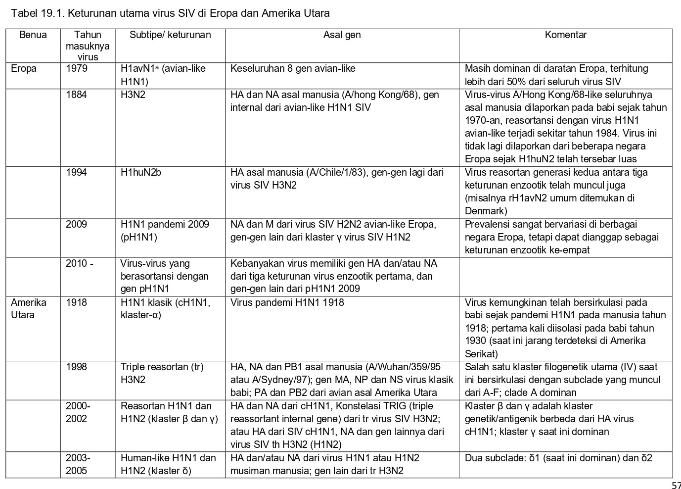Virus AI babi dari subtipe H1N1, H3N2, dan H1N2 bersifat enzootik pada babi di seluruh dunia, namun asal mereka, demikian juga karakteristik genetik dan antigeniknya berbeda antar benua dan wilayah geografis [94]. Selama dekade terakhir, banyak virus keturunan SIV H1 dan H3 yang muncul, umumnya merupakan akibat penularan virus dari manusia ke babi dan kemudian karena reasortansi dan evolusi genetik virus-virus asal manusia ini di dalam populasi babi [61]. Seiring waktu, virus SIV juga mengalami antigenik drift dalam HA, meskipun proses ini pada umumnya lebih lambat pada babi daripada pada manusia [16]. Salah satu fitur untuk epidemiologi virus SIV adalah keturunan genetik berbeda dari virus H1 dan H2 dapat eksis bersama-sama. Tabel 19.1 menyajikan rangkuman keturunan utama virus-virus SIV di Eropa dan Amerika Utara [3, 9, 40, 52, 74]. Sekuens HA dari beberapa keturunan H1 virus SIV berbeda sampai 20 – 25% di level asam aminonya. Perbedaan genetik sebesar itu ada diantara tiga keturunan virus H1N1 avian-like Eropa (H1avN1), H1N2 human-like (H1huN2), dan H1N1 pandemi 2009 pH1N1), dan antara virus H1 SIV Amerika Utara dari klaster 𝛿 dan klaster-klaster lainnya. Perbedaan genetik yang lebih kecil terjadi antara klaster H1 𝛼, β, dan ℽ, dan antara klaster H3 Amerika Utara, demikian juga di dalam setiap keturunan virus. Virus SIV di Amerika Selatan dan Asia berasal dari subtipe HA dan NA yang sama dengan virus-virus Eropa dan Amerika Utara, tetapi banyak diantaranya dari keturunan genetik yang berbeda [11, 13, 108]. Virus pH1N1 2009 telah menetap di populasi babi di seluruh dunia setelah terjadinya penularan berulang dari manusia kepada babi sejak tahun 2009. Virus baru ini telah bereasortansi secara ekstensif dengan hampir seluruh virus SIV yang menetap di wilayah regional masing-masing, menyebabkan berkembangnya genotipe SIV baru dan gambaran epidemiologiknya yang menjadi semakin kompleks. Di Eropa, perbedaan virus SIV antar antar wilayah regional telah menjadi semakin jelas sejak tahun 2009 [9, 74]. Di Amerika Serikat setidaknya ada 10 pola genotipe H3N2 telah muncul, bersama reaktivitas silang hasil serologis yang tidak konsisten antara virus tersebut [24, 40, 48]. Sudah jelas dari hal ini bahwa epidemiologi influenza pada babi lebih kompleks jika dibandingkan dengan manusia, dan karena itulah hal ini menyebabkan masalah pada seleksi strain untuk produksi vaksin.