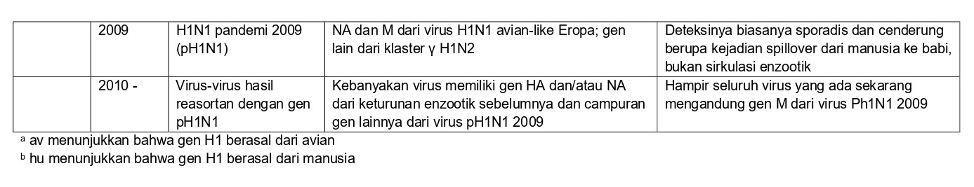 Influenza babi adalah penyakit pernafasan akut pada babi yang disebabkan oleh virus influenza A H1N1, H3N2, dan H1N2 (direview oleh van Reeth, dkk. [82]). Virus-virus ini biasanya berasal dari manusia atau unggas, dan kebanyakan virus influenza yang telah beradaptasi pada babi adalah akibat dari reasortansi genetik antara virus-virus yang telah menetap pada babi dengan virus-virus yang baru saja diperkenalkan dari manusia atau unggas. Dalam Bab ini kita akan menggunakan sebuah istilah tradisional yang dikenal luas untuk menyebut virus influenza pada babi, yaitu ”swine influenza virus (SIV)” untuk menyebut virus influenza A yang telah menetap dalam populasi babi, meskipun rekomendasi terkini yang diberikan oleh OFFLU adalah untuk menggunakan istilah “virus influenza A pada babi”. SIV bereplikasi dalam sel epidel saluran pernafasan atas dan bawah babi, dan terutama pada paru-paru. Tidak terjadi infeksi sistemik, dan transmisi virus terjadi secara eksklusif melalui rute respirasi. Infeksi berlangsung selama hanya 6 – 7 hari, dan gejala seperti gangguan pernafasan, demam dan lemah membaik dalam waktu beberapa hari saja. Meskipun infeksi jarang sekali fatal, masih terdapat potensi dampak ekonomi yang signifikan dikarenakan berkurangnya berat tubuh pada babi yang sedang bertumbuh, dan kegagalan reproduksi pada induk babi disebabkan oleh demam tinggi. SIV juga mungkin berkontribusi dalam timbulnya permasalahan penyakit respirasi kronis dan multifaktorial. Kebanyakan infeksi yang tidak kompleks adalah infeksi subklinis atau sangat ringan. Berkembang atau tidaknya gejala klinis tipikal “flu babi” sebagian besarnya tergantung pada status imun babi, tekanan infeksi, dan viral load yang muncul pada paru-paru selama 24 jam pertama penentu infeksi. Metode utama untuk mengendalikan SIV adalah dengan vaksinasi untuk imunitas aktif atau pasif, yang akan mencegah infeksi atau mengurangi titer virus dalam paru-paru yang akan mencegah penyakit.