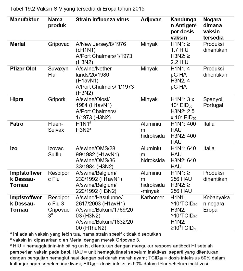 Di Eropa, vaksin SIV pertama kali dilisensikan pada pertengahan 1980-an dan awal 1990-an. Vaksin ini mengandung dua subtipe virus influenza yang dominan pada saat itu, yaitu H1avN1 dan H3N2. Pada kebanyakan vaksin ini, produksinya dihentikan di tahun 2010, tetapi vaksin-vaksin tersebut telah digunakan pada banyak penelitian uji tantang vaksinasi eksperimental. Vaksin trivalen yang mengandung subtipe H1huN2 diberikan perizinan tahun 2010, dan saat ini adalah vaksin utama pada pasar Eropa. Di beberapa negara, vaksin pH1N1 monovalen 2009 kadang-kadang diimpor dari Amerika Utara. Produk vaksin yang digunakan dan kebijakan vaksinasi dapat sangat bervariasi antar negara, akan tetapi strain vaksin sangat jarang diperbaharui. Seperti yang ditunjukkan dalam Tabel 19.2, tidak mungkin membandingkan massa antigenik dari berbagai produk komersial, karena produsen vaksin yang berbeda menggunakan metode yang berbeda untuk mengukur dan mengekspresikan jumlah antigen. Di sebagian besar negara Eropa, hanya 10-20% dari populasi induk babi yang divaksin SIV, dan vaksin jarang digunakan pada babi yang digemukkan.