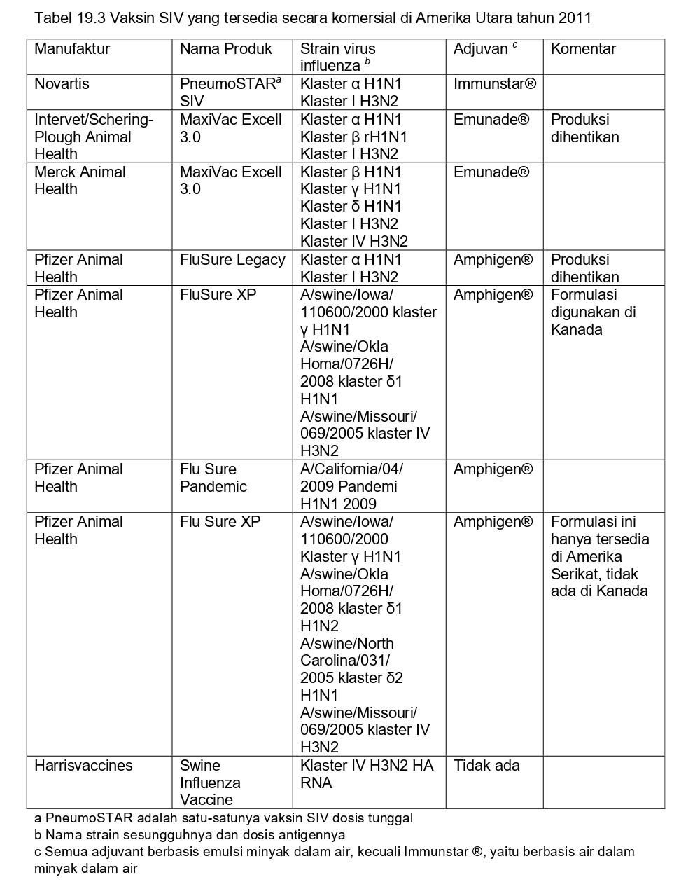 Vaksin AI babi inaktif komersial berbagi kesamaan dengan vaksin influenza ‘killed’/mati pada manusia, akan tetapi juga terdapat perbedaan yang penting. Sementara vaksin manusia pada umumnya mengandung antigen permukaan virus yang sudah dimurnikan tanpa adjuvan (untuk informasi lebih lanjut, baca Fiore, dkk [26]), kebanyakan vaksin SIV adalah preparasi virus penuh (whole-virus) dengan adjuvan berbasis minyak. Tidak seperti vaksin manusia, untuk vaksin SIV tidak ada standar dosis antigen dan strain vaksinnya. Konsisten dengan perbedaan antigen dan genetik virus SIV antara Eropa dan Amerika Utara, vaksin untuk setiap wilayah geografis ini diproduksi secara lokal dan vaksin-vaksin tersebut mengandung strain yang sangat jauh berbeda. Di setiap benua, strain vaksin yang ada mungkin berbeda antar produk yang berbeda, demikian juga formulasi adjuvannya dan dosis antigennya. Hal ini digambarkan dalam Tabel 19.2 untuk vaksin-vaksin di Eropa dan dalam Tabel 19.3 untuk vaksin-vaksin di Amerika Utara.